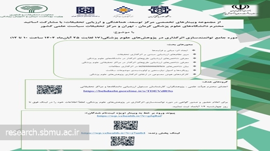 مرکز توسعه، هماهنگی و ارزیابی تحقیقات وزارت بهداشت، درمان و آموزش پزشکی با همکاری دانشگاه‌های علوم پزشکی تهران و کرمان و مرکز تحقیقات سیاست علمی کشور، « برنامه جامع توانمندسازی اثرگذاری در پژوهش‌های علوم پزشکی» برگزار می‌کند.